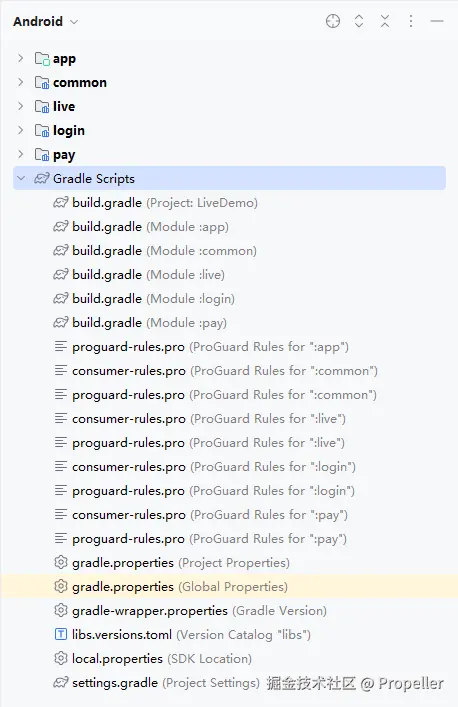 配置壳工程前我们要了解常见 gradle 文件的作用,还是以我们在开始提到的 LiveDemo 分包为例。
