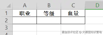 同样想想Excel表格,每个表头字段填写在第一行,而第二行则代表了各个字段对应的值。如下图所示,“”职业“”对应A2单元格内容、“等级”对应B2单元格内容、“血量”对应C2单元格内容。