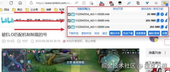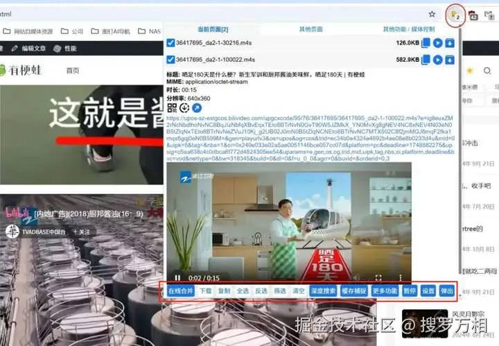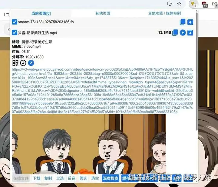 当我们在浏览器里打开视频页面时,插件则会自动嗅探视频资源,只需要点击右上角“猫抓”插件图标后,调出功能窗口,是MP4格式的直接点击下载即可。