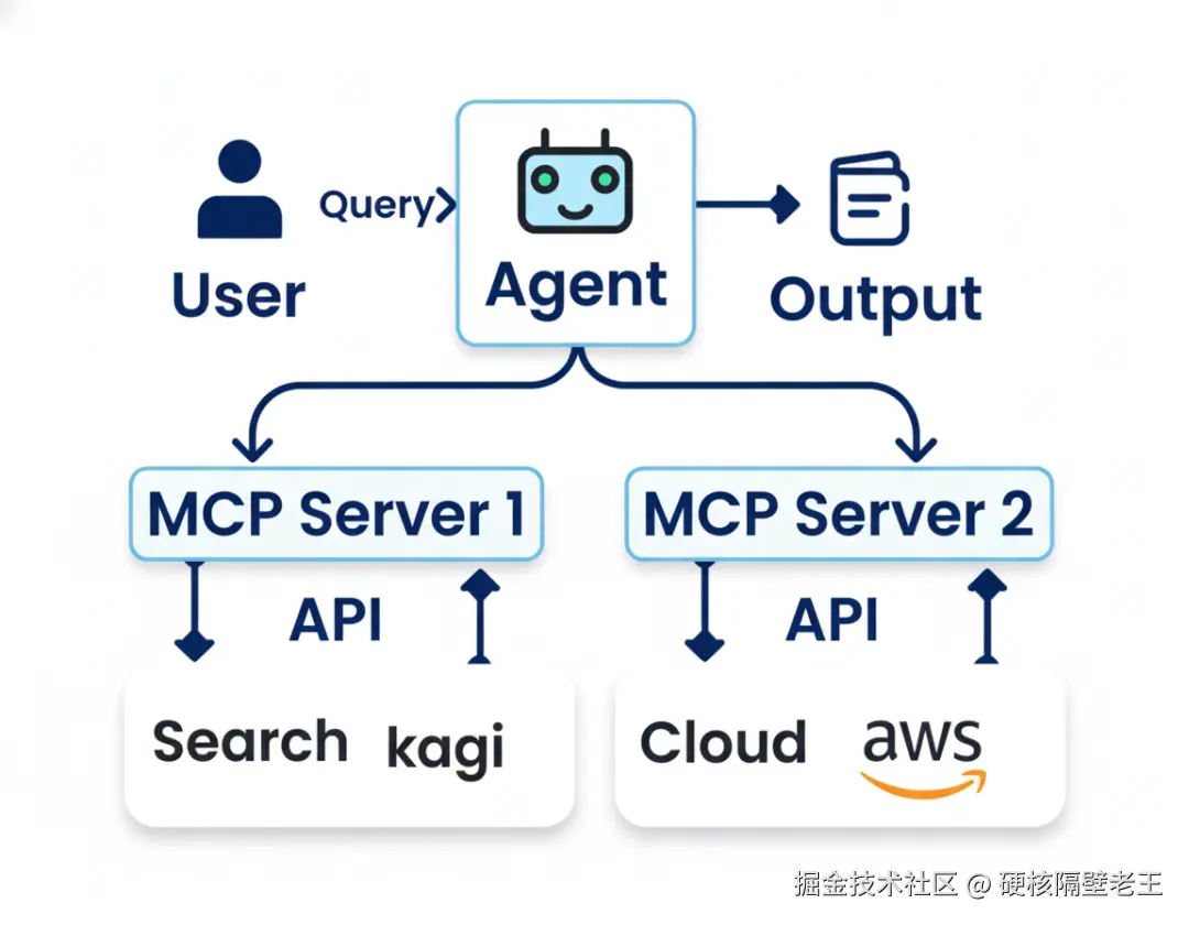 Cursor等现代AI开发工具展示了一种更加轻量级的智能体设计理念。通过Model Context Protocol(MCP),智能体可以无缝访问各种外部服务和API,如Kagi搜索、AWS云服务等,而几乎不需要执行复杂的代码逻辑。这种模式的核心优势在于将工具能力标准化和模块化,智能体只需要理解工具的接口定义,就能够调用相应功能。