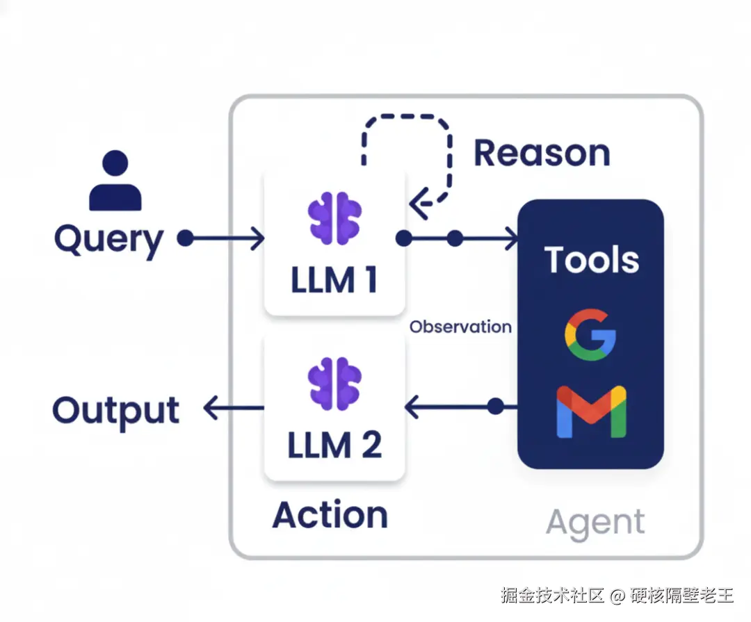 ReAct(Reasoning and Acting)是目前应用最广泛的智能体架构,它将大模型的推理能力与外部工具的执行能力有机结合。在这个框架中,智能体在接收到用户查询后,会交替进行推理和行动两个步骤。推理阶段由LLM分析问题并决定下一步动作,行动阶段则调用具体的工具(如Google搜索、邮件发送等)执行任务,工具返回的结果会再次输入到LLM中进行下一轮推理。这种循环往复的过程使智能体能够处理需要多步骤、多工具配合的复杂任务。