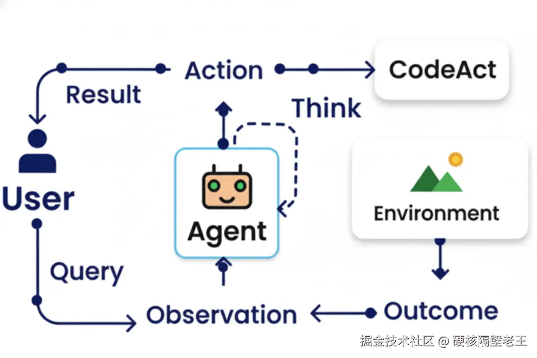 从用户查询到最终结果的过程中,智能体会在思考阶段生成代码,在环境中执行后观察结果,并根据执行结果决定是否需要继续迭代。这种设计特别适合需要进行数据分析、科学计算或复杂业务逻辑处理的场景。