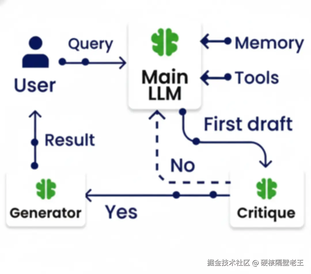 Self-Reflection模式引入了智能体的自我评估和迭代优化能力。在生成初始输出后,系统会启动一个评判者角色,对输出进行批判性分析,识别潜在的错误、不一致或可改进之处。如果评估结果不满意,主LLM会根据反馈重新生成输出,这个过程可以进行多轮迭代,直到达到预设的质量标准。