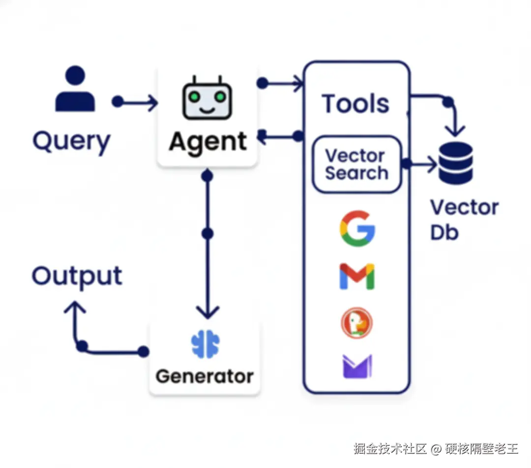 Agentic RAG是检索增强生成(RAG)技术的智能体化升级。传统RAG系统通常采用固定的检索策略,而Agentic RAG让智能体能够主动决定何时检索、检索什么内容、如何使用检索结果。智能体可以访问向量数据库以及各种外部工具,根据查询的复杂度动态调整检索策略,然后由生成器基于检索到的相关信息产生最终输出。