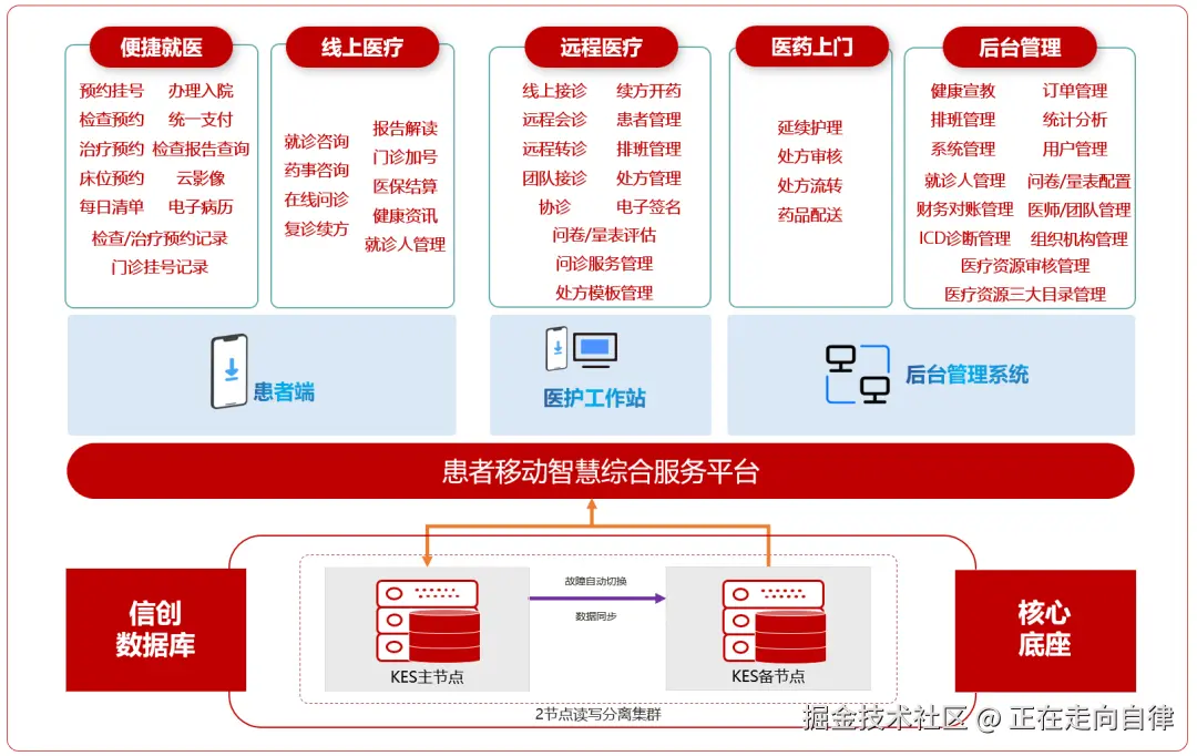 平台采用金仓高可用数据库集群架构,支撑患者端、医护工作站、后台管理系统三类业务场景,满足以下技术要求: