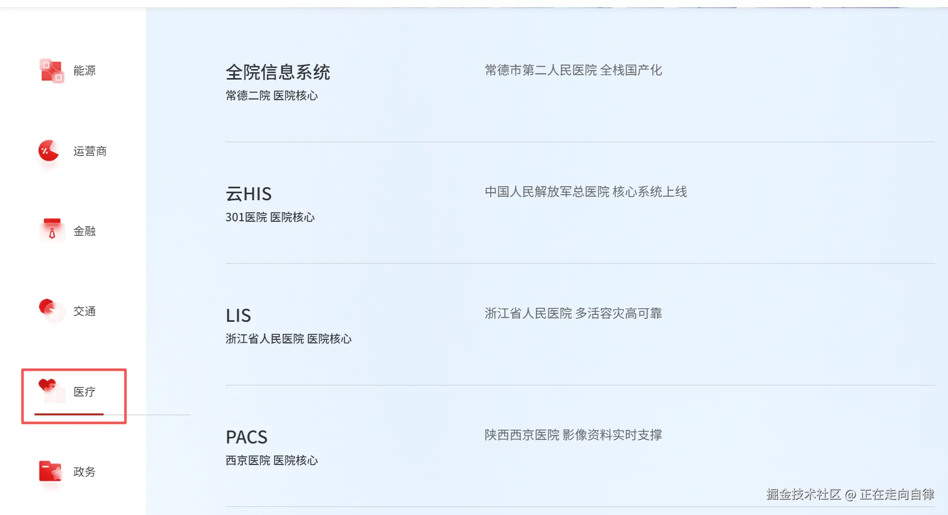 1.诊疗业务系统:HIS(医院信息系统)、EMR(电子病历)、PACS(影像归档和通信系统)、LIS(实验室信息系统)。