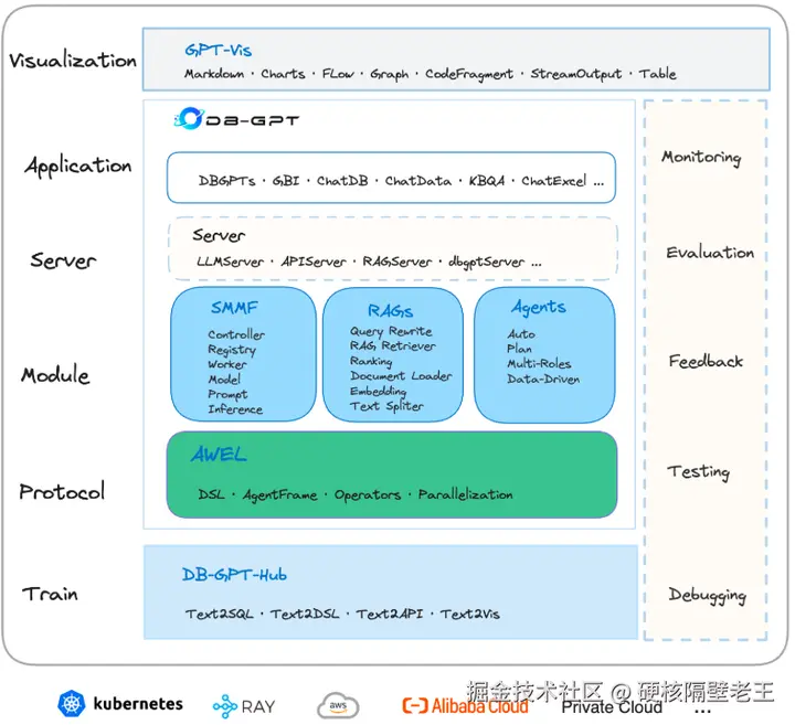 DB-GPT 的多层架构完整覆盖了从 数据交互 → 语义理解 → 模型生成 → 结果展示 → 反馈优化 的全过程,堪称企业级 AI 数据交互的标杆。