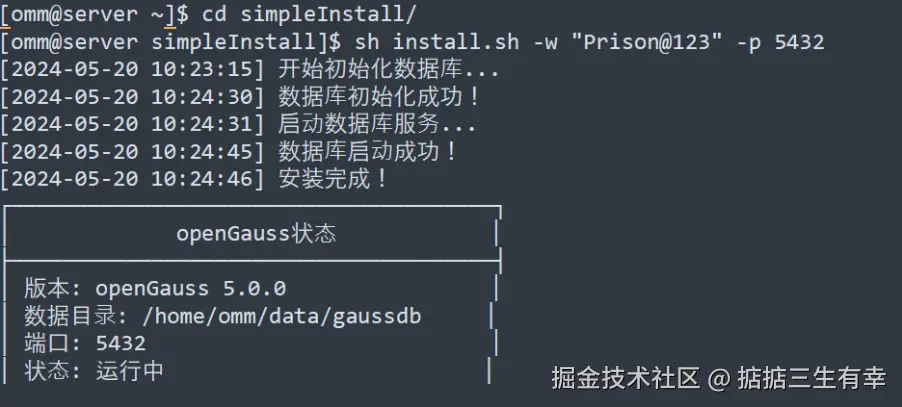 安装完成后,自动以 omm 用户连接到数据库