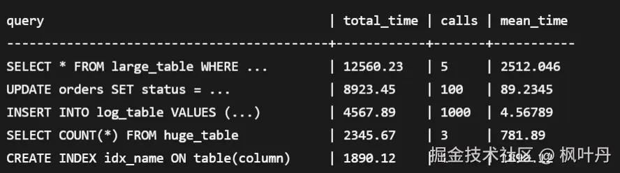 -- 1. 查询当前最耗时的SQL语句(类似PG_STAT_STATEMENTS)