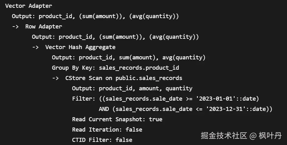 执行计划输出中将显示 Vectorator ,表明查询使用了向量化引擎。