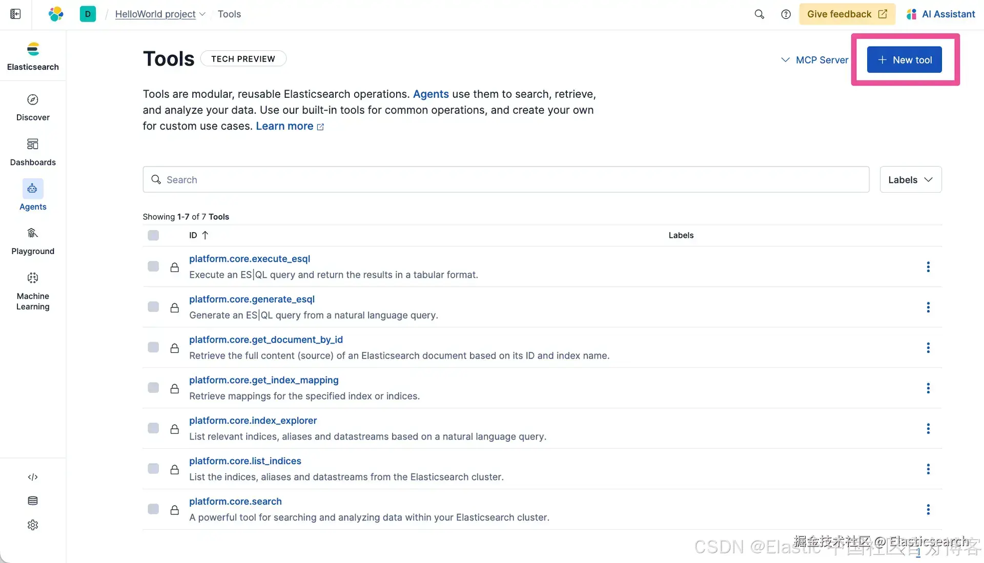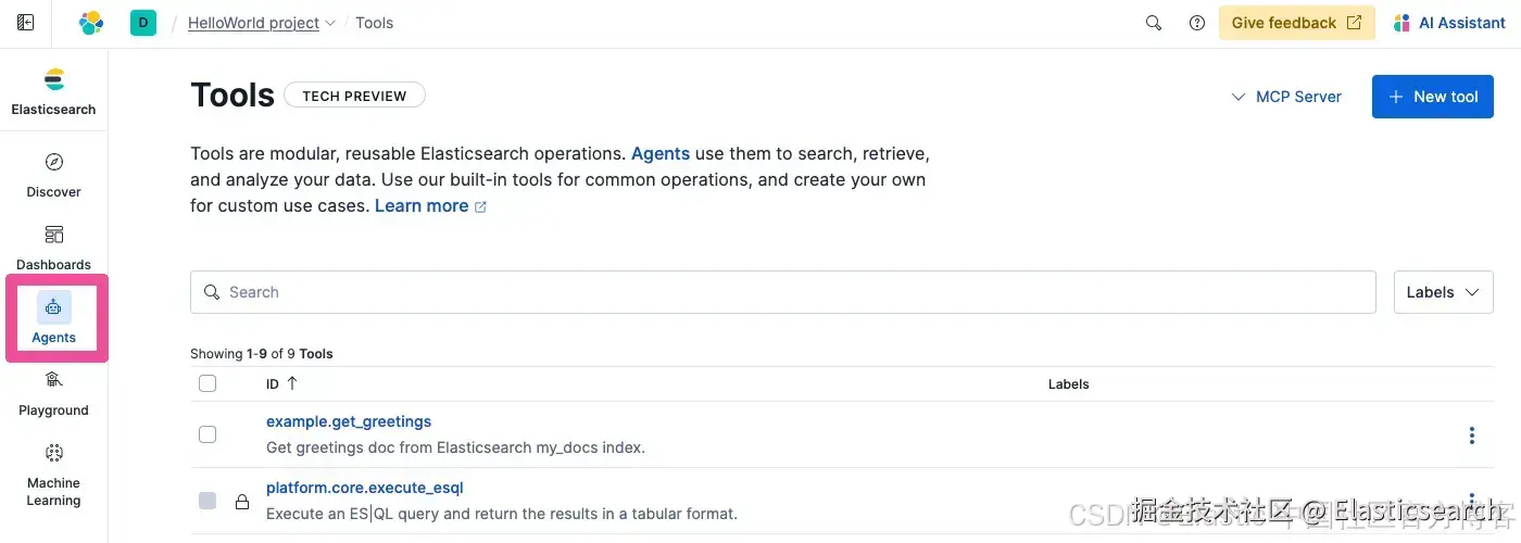 如你所见,Elastic Agent Builder 中的默认 agent 已经可以用来与你的数据聊天,但要真正赋予 agent 自定义能力,它们需要通过 Model Context Protocol (MCP) 访问 tools。Agent Builder 拥有完整的 tool 创建和管理功能,你可以用它快速创建自定义 MCP tools,这些 tools 会托管在与数据相同的可扩展 Elastic 项目中。