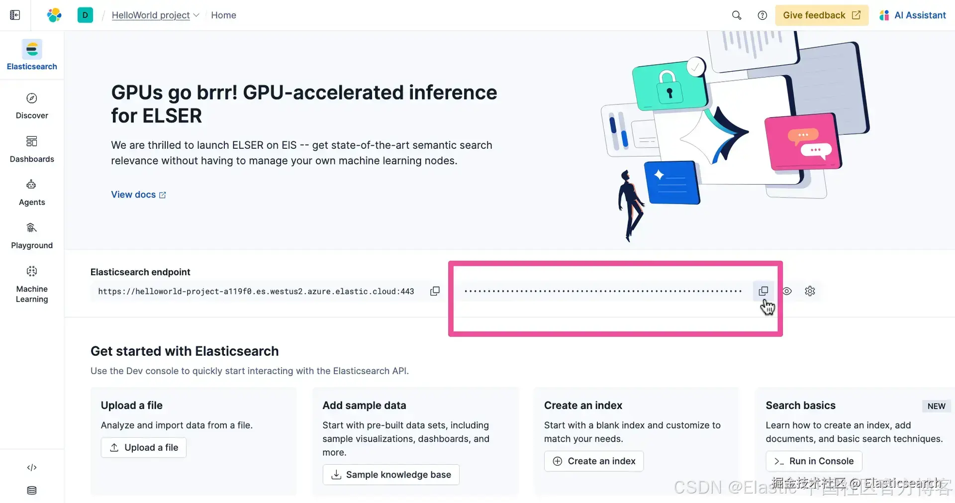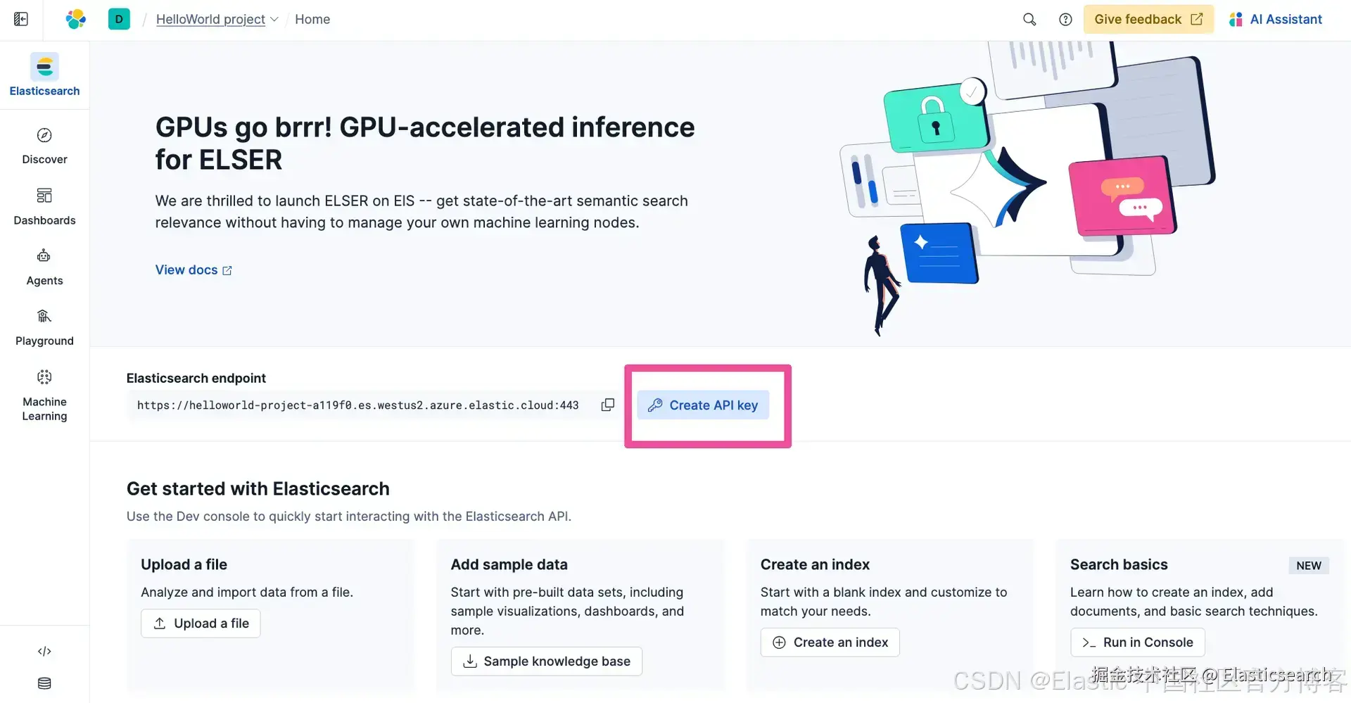 下一个需要在 .env 文件中替换的占位符文本是 。我们将用来自你的 Elastic 项目的实际 API Key 替换它。回到你的 Elastic 项目,在导航菜单中点击 Elasticsearch。