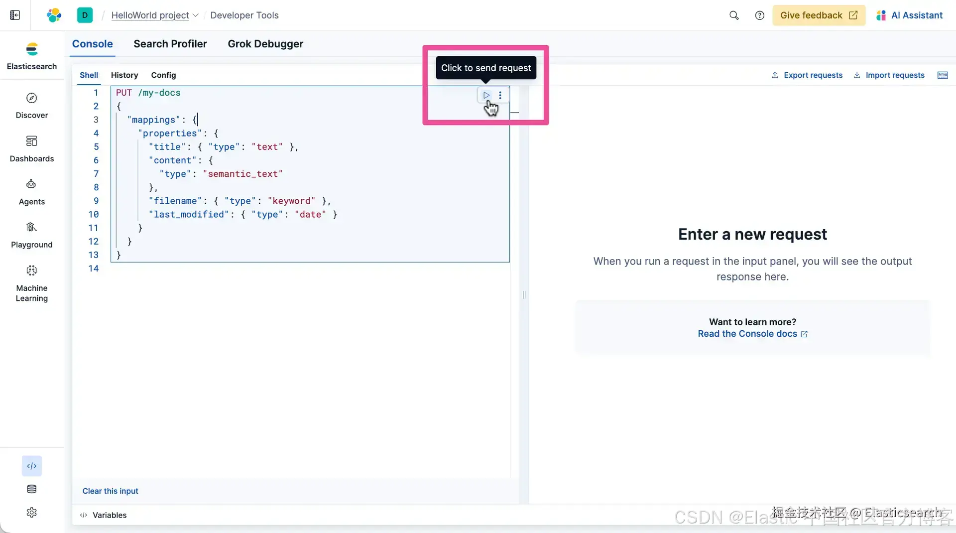 复制下面的 PUT 命令,它会创建一个名为 my-docs 的索引,包含多种字段,以及利用语义搜索的内容。