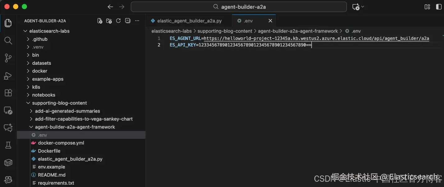 回到 Visual Studio Code,在 .env 文件中找到占位符文本 “YOUR-ELASTIC-AGENT-BUILDER-URL>”,并粘贴复制的 MCP Server URL 来替换占位符文本。现在编辑粘贴的 MCP Server URL。删除 URL 末尾的 “mcp” 文本,并替换为 “a2a”。编辑后的 URL 应该看起来像这样: