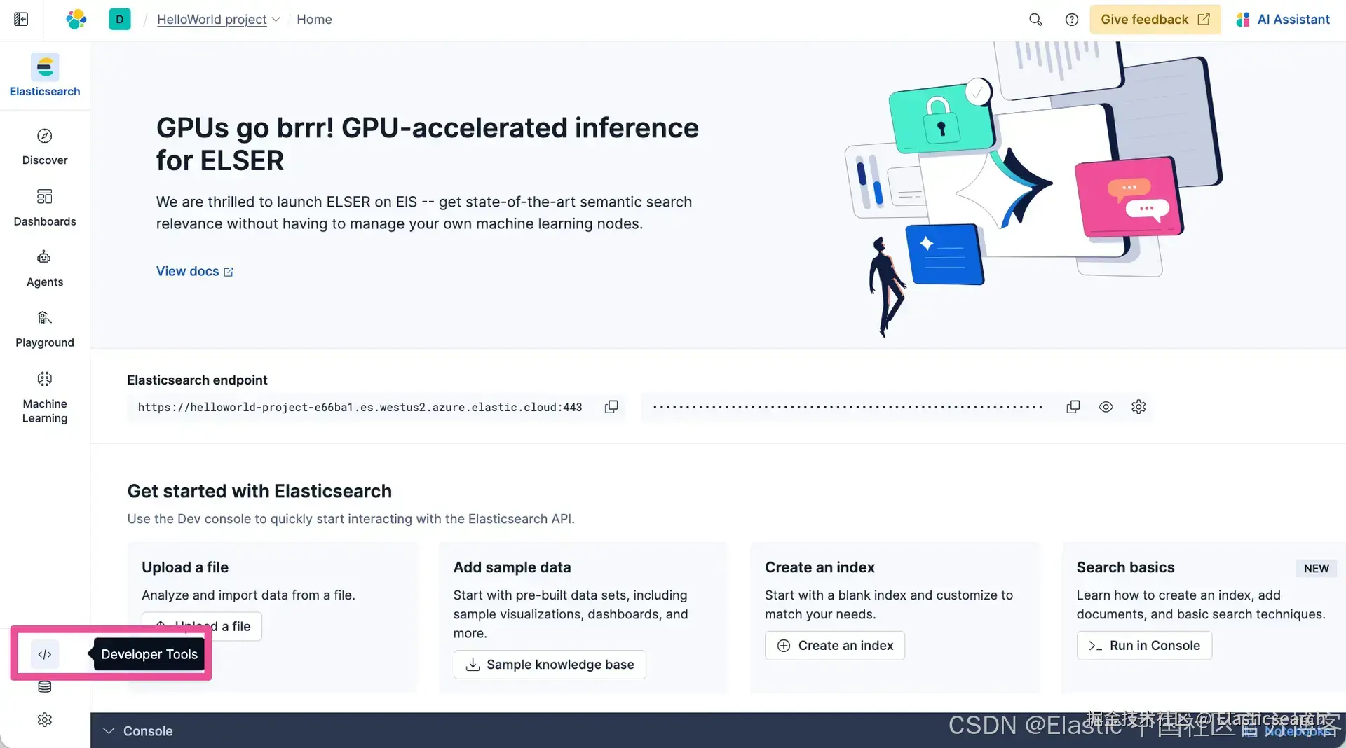 现在我们已经有了一个 Elastic 项目,让我们创建一个索引,这是 Elasticsearch 用来存储数据的地方。打开 Elastic Cloud 中的 Developer Tools,我们可以在这里运行命令来创建一个索引。