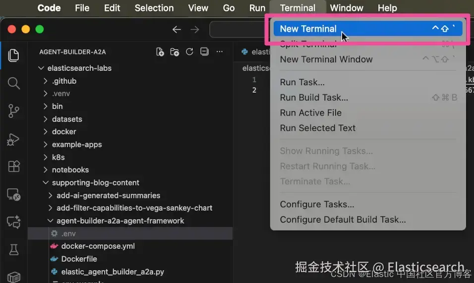 在 Visual Studio 文件资源管理器中,展开 supporting-blog-content 和 agent-builder-a2a-agent-framework 文件夹,然后在文本编辑器中打开名为 elastic_agent_builder_a2a.py 的文件。
