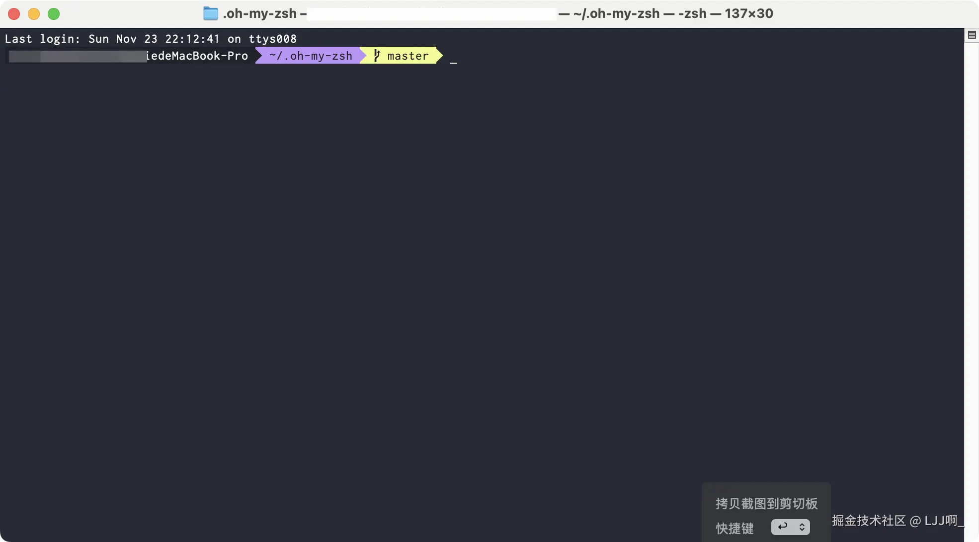 2、安装成功后,这时重启终端,可以看到默认oh-my-zsh的终端效果,但是整体的主题背景颜色没有改变,只是改变了字体颜色。这是正常效果,因为oh-my-zsh只是美化字体,整体主题效果需要额外配置,后续会讲。这时磁盘会有/Users/[你的用户名]/.oh-my-zsh。但是oh-my-zsh默认不显示全路径的问题后面再说。