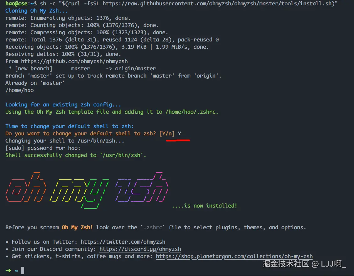 注意:同意使用 Oh-my-zsh 的配置模板覆盖已有的 .zshrc。会覆盖之前的.zshrc配置。如果之前在使用.zshrc时自定义了一些环境变量、别名等,你需要手动迁移这些自定义配置。