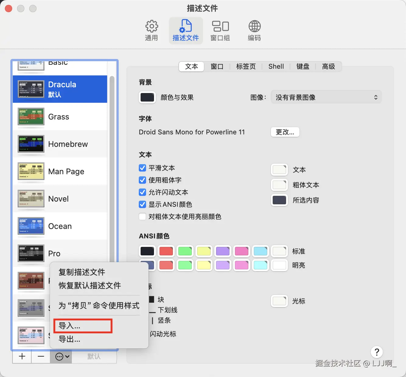 2、在菜单栏上打开终端设置,进入描述文件,导入对应的,如Dracula.terminal颜色配置文件。