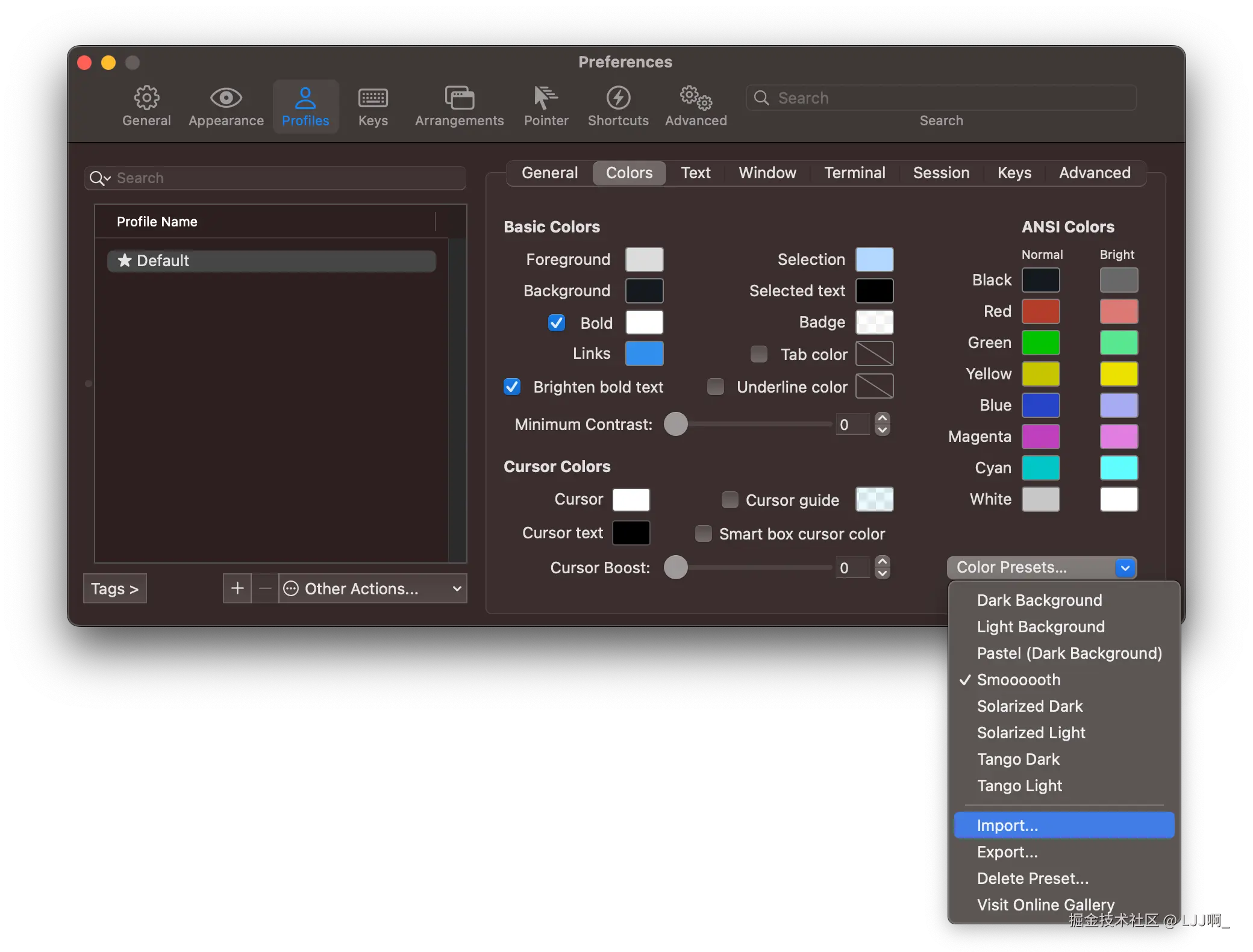 2、打开item2,在菜单栏上方打开设置settings设置中,「Import」中选择对应的 .itermcolors 文件即可。