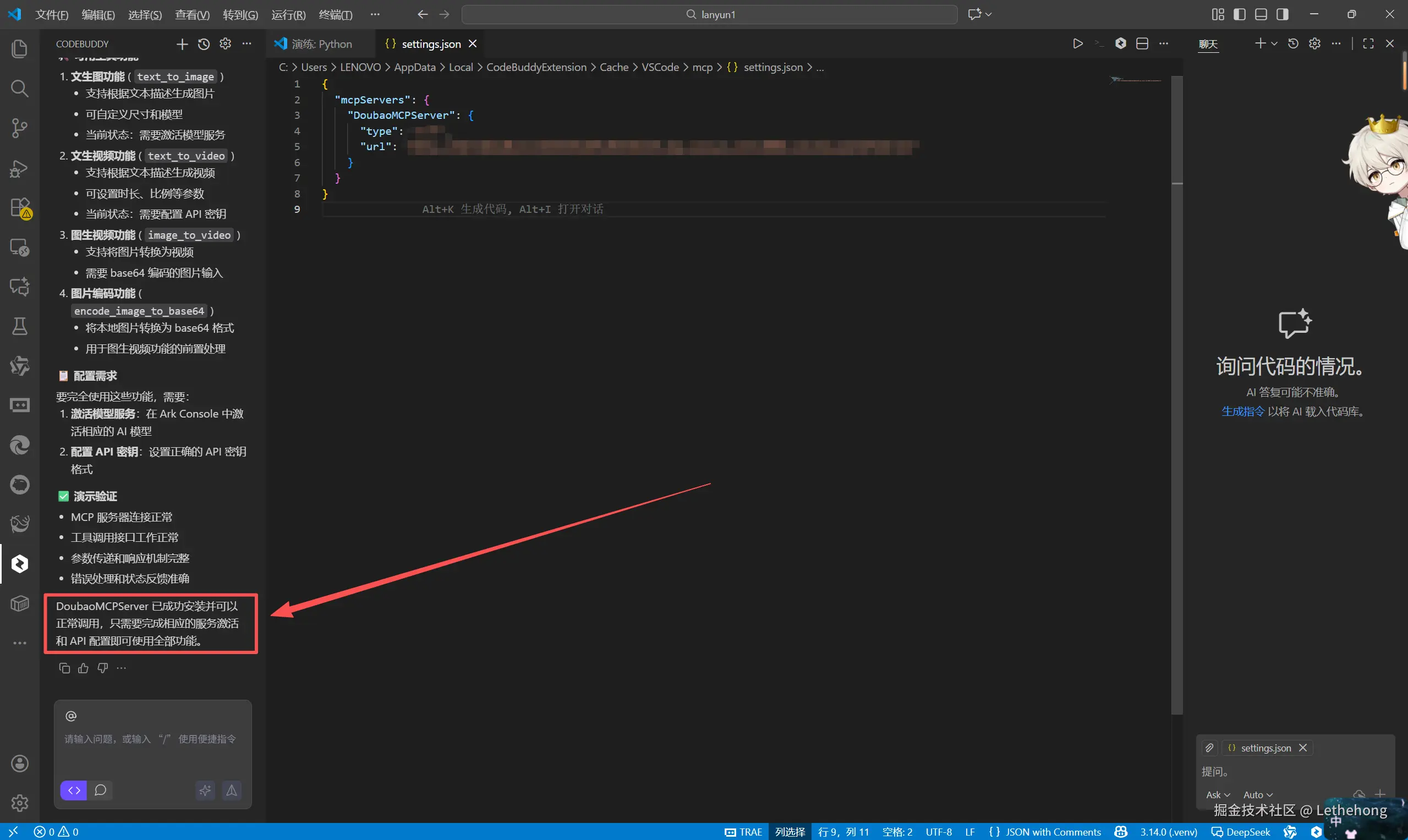 这里,DOUBAO_API_KEY需要替换为从火山引擎获取的豆包模型的API密钥。配置完成后,VSCode会自动检测到MCP服务器,并在命令面板中提供“MCP: List Connected Servers”等命令,用于验证服务器连接状态。