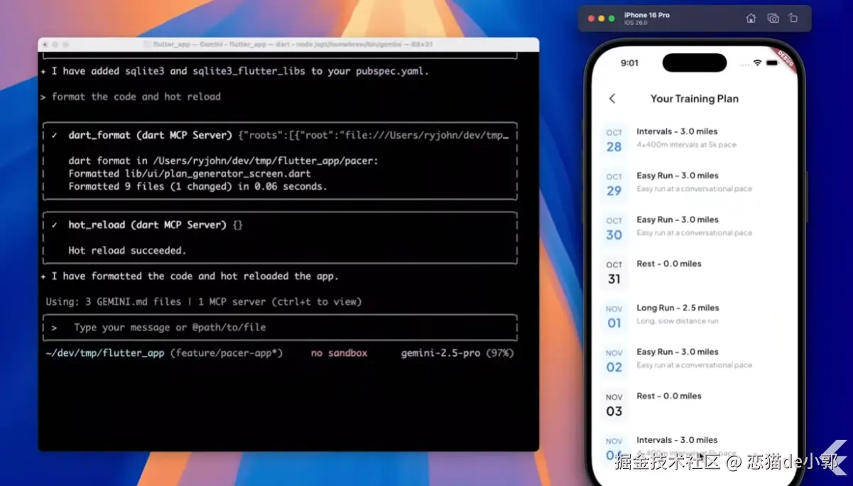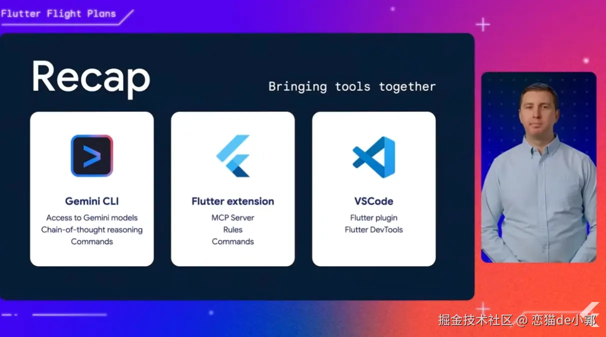 在 Flutter + AI 的展示上,官方首先展示了 Gemini CLI + Flutter Extension for Gemini CLI (MCP)如何通过 AI 自动化从零开发一个 App 。