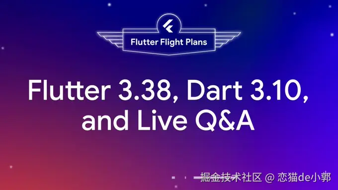 在 Flutter 官方刚举行的 Flutter Flight Plans 直播里,除了发布 Flutter 3.38 和 Dart 3.10 之外,其实还有不少值得一聊的内容,例如企业级的 Flutter 案例展示,Flutter + AI 的场景,重点还有针对大量热门问题的 Q&A(多窗口、GenUI、PC\Web 插件) 等。