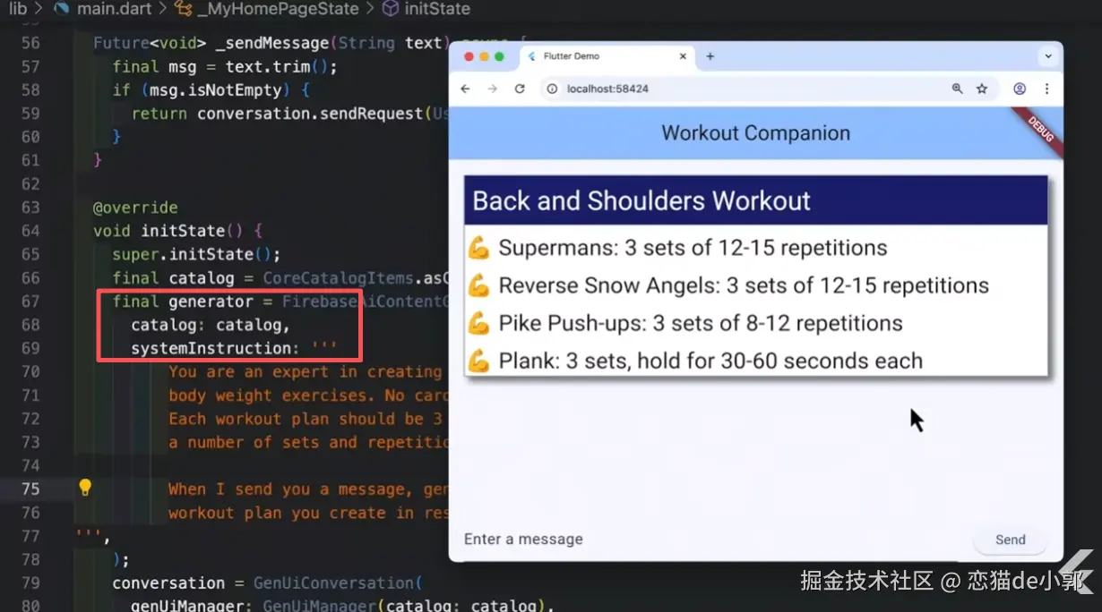 其核心理念就是,允许 AI Agent 使用开发者提供的一个 Widget 目录 (Catalog),然后让 AI 根据用户需求生成和展示相应的 UI 组件 ,在展示里,官方演示了如何将 Gen UI 核心包和 Firebase 适配器集成到应用中,并创建了一个 自定义 Widget Catalog Item (WorkoutCard),让 AI 代理能够根据用户提示生成包含自定义 UI 的健身计划 。