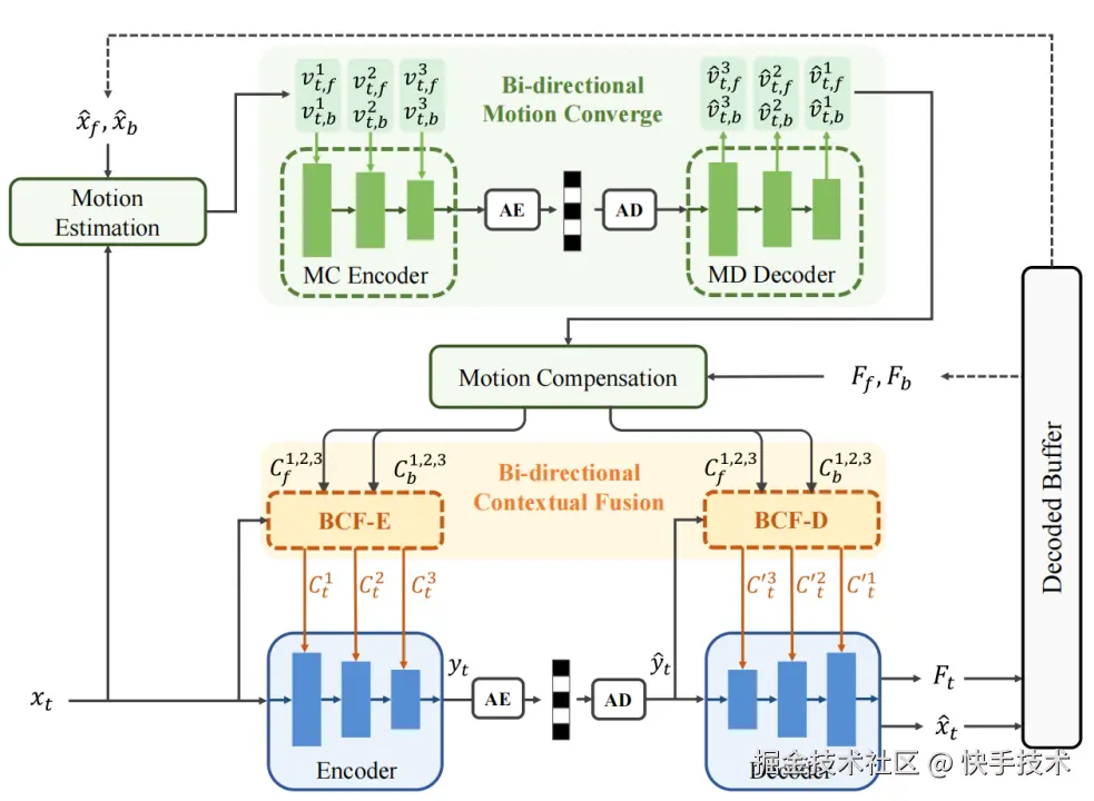 针对这一瓶颈,快手研究团队提出了全新的 BRHVC 编码框架,通过引入 双向运动融合(BMC) 与 双向上下文融合(BCF) 两大关键创新模块,实现了对参考信息的自适应调和。得益于更精准的运动刻画和更均衡的参考融合机制,BRHVC 在压缩性能上超越最新传统标准 VTM-RA 编码器,取得了双向智能视频压缩领域的重要突破,也为未来智能视频编码的发展提供了新的方向。