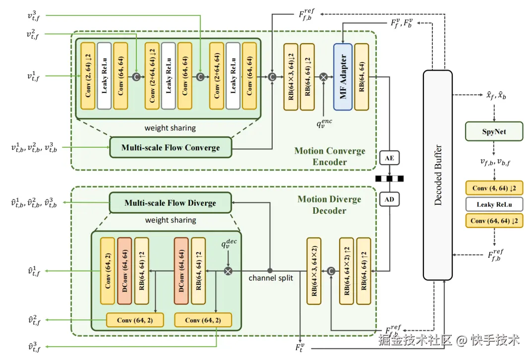 BMC 模块针对长跨度运动估计难题,将光流网络生成的多尺度光流(原始、1/2 分辨率、1/4 分辨率)收敛至单一隐变量进行联合压缩,并引入双向参考帧间的互运动特征作为先验,动态适配不同帧类型的信息需求。这种设计突破过往光流压缩的局限,使网络在解码端能重构出覆盖更大感受野的准确运动场,显著提升大位移场景下的运动补偿精度。