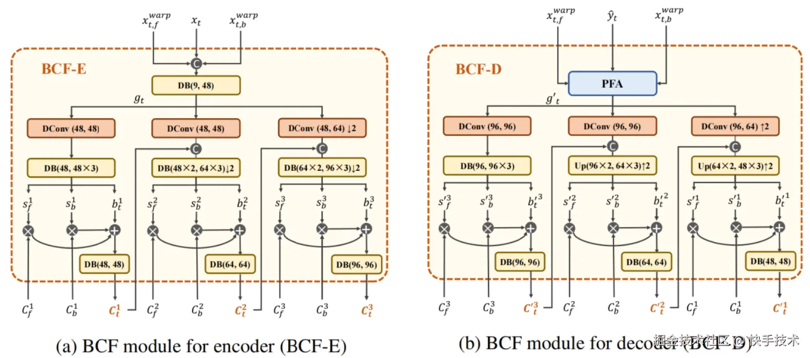 BCF 模块则针对不平衡参考贡献问题,在编码端通过计算当前帧与双向运动补偿结果在像素域的相似度差异,生成空间自适应权重图与偏置项,将参考特征在通道维度按重要性重新加权融合;解码端则利用熵解码后的潜变量重建权重信息,实现与编码端协同。