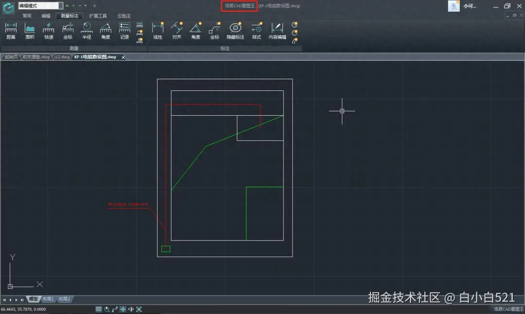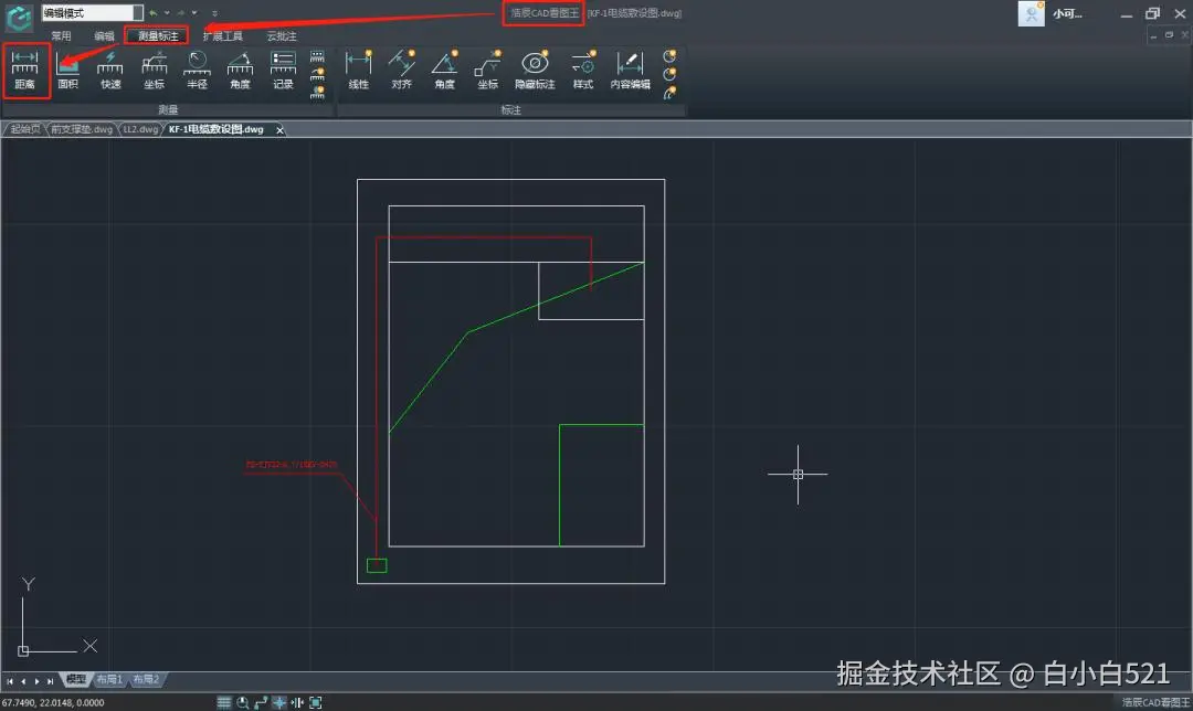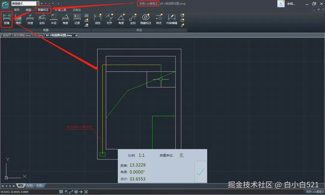 1. 在浩辰CAD看图王电脑版界面上方点击 “测量标注” ,在“测量标注”菜单栏中选择 “距离” 测量。