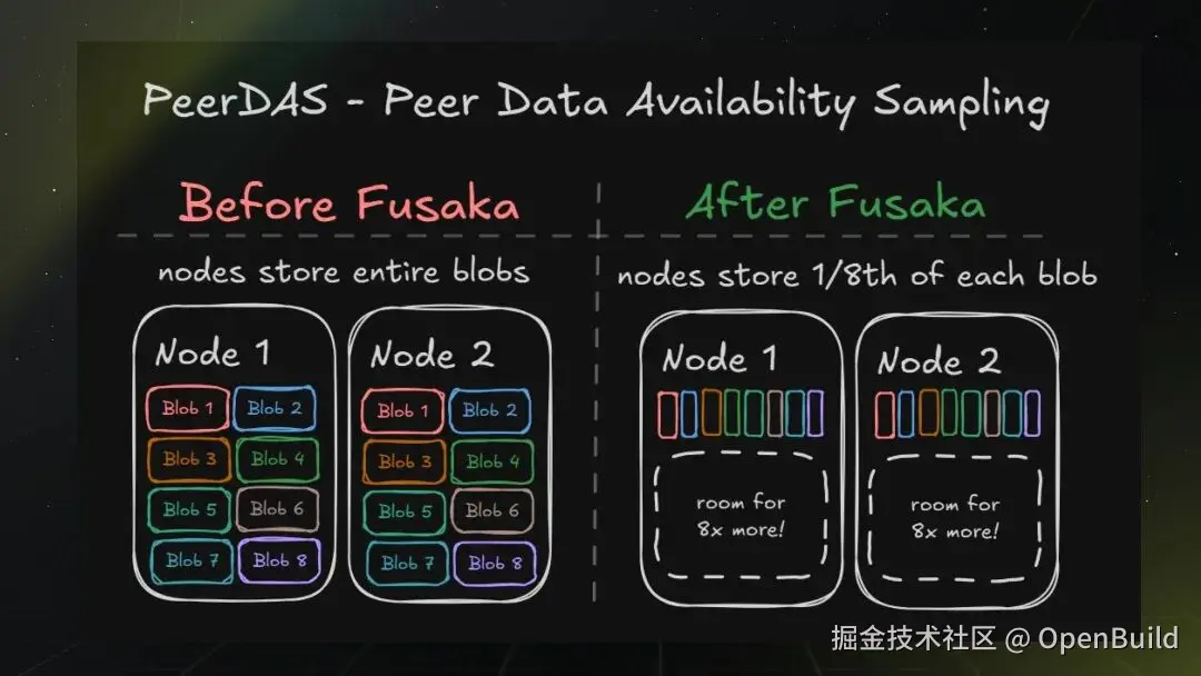 它允许节点仅存储每个 Blob 的部分数据,而非完整 Blob。更具体地说,节点现在只需存储 Blob 数据的 1/8—— 这意味着在不提升节点硬件配置要求的前提下,Blob 数据存储空间可直接提升 8 倍。