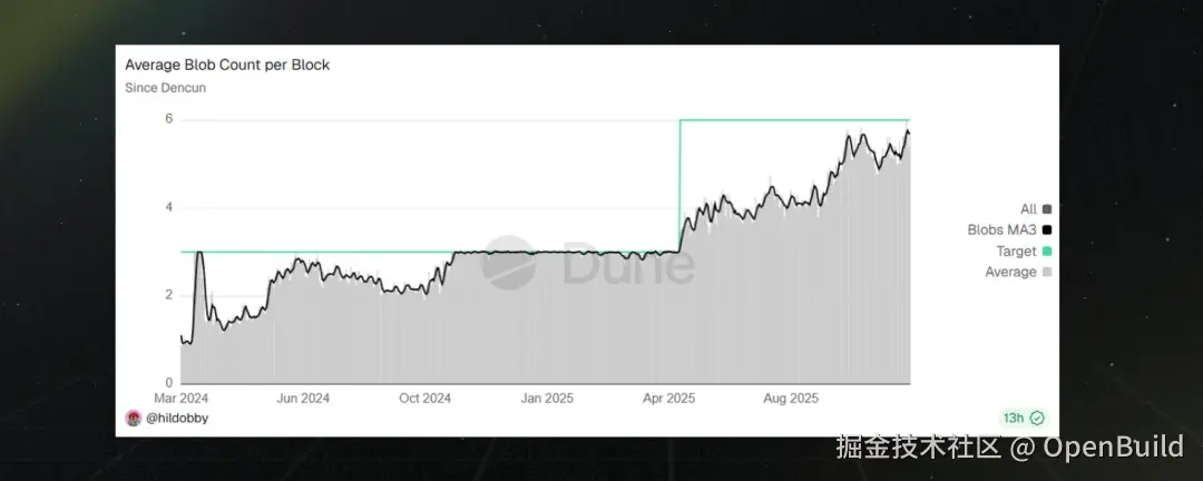 目前,以太坊设定的每区块 Blob 目标容量为 6 个 —— 自 8 月以来,实际容量已基本接近这一目标。随着 L2 网络交易量稳步增长,Blob 已成为以太坊主网可靠的数据可用性层(Data Availability Layer)。