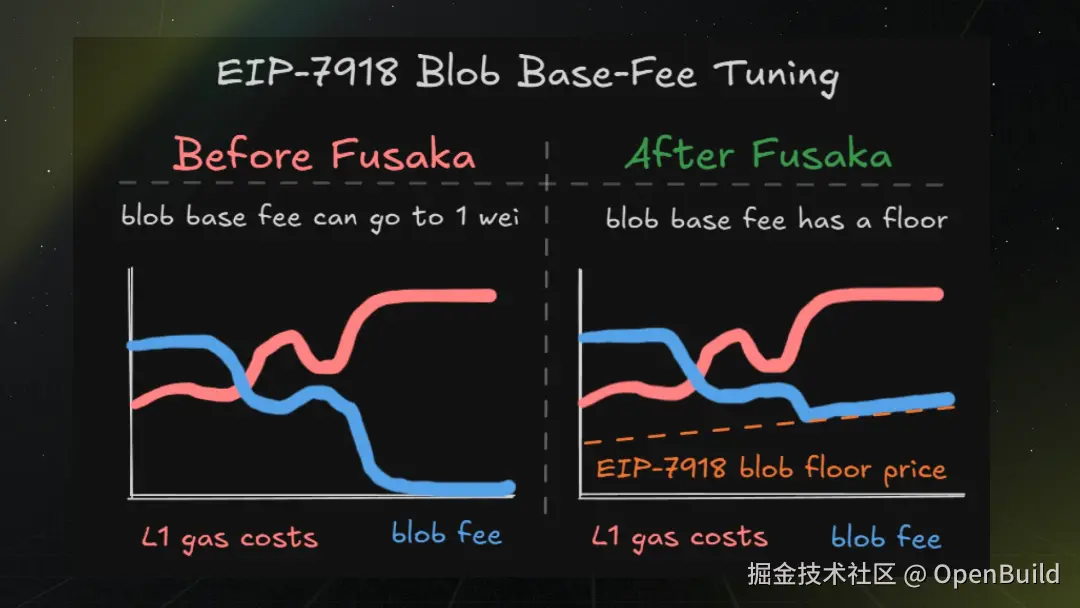 EIP-7918 通过引入 “费率下限”(price floor**)解决了这一问题:它确保 Blob 费用始终能与 L1 Gas 费保持合理比例,避免费率降至过低水平。