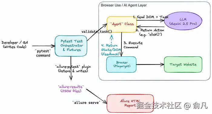 整个流程从开发者开始,他用自然语言编写测试并执行 pytest 命令。该命令激活 pytest 框架,作为中央编排器,其首要任务是查阅 conftest.py 文件,为诸如 Gemini LLM 实例和浏览器会话等工具做好准备,这些固定功能随后将对所有测试开放。每个测试都提供自然语言任务和预期输出。