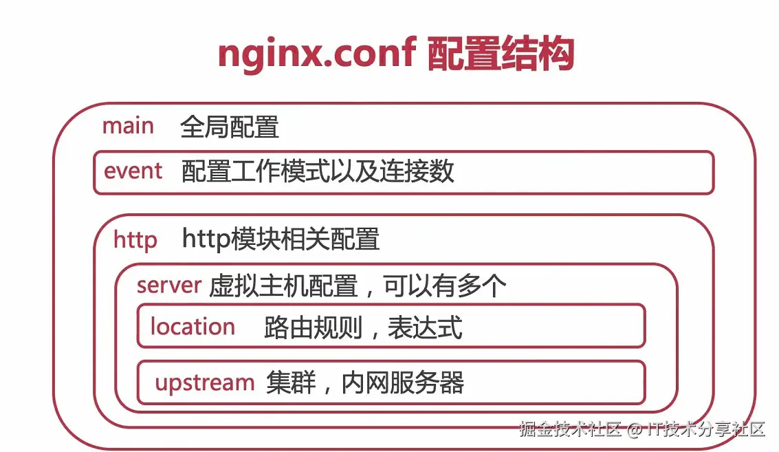 一个标准的nginx.conf文件遵循清晰的层级结构,从外到内依次是: