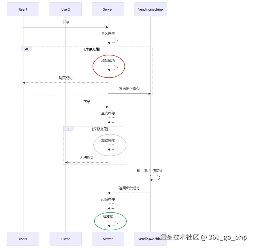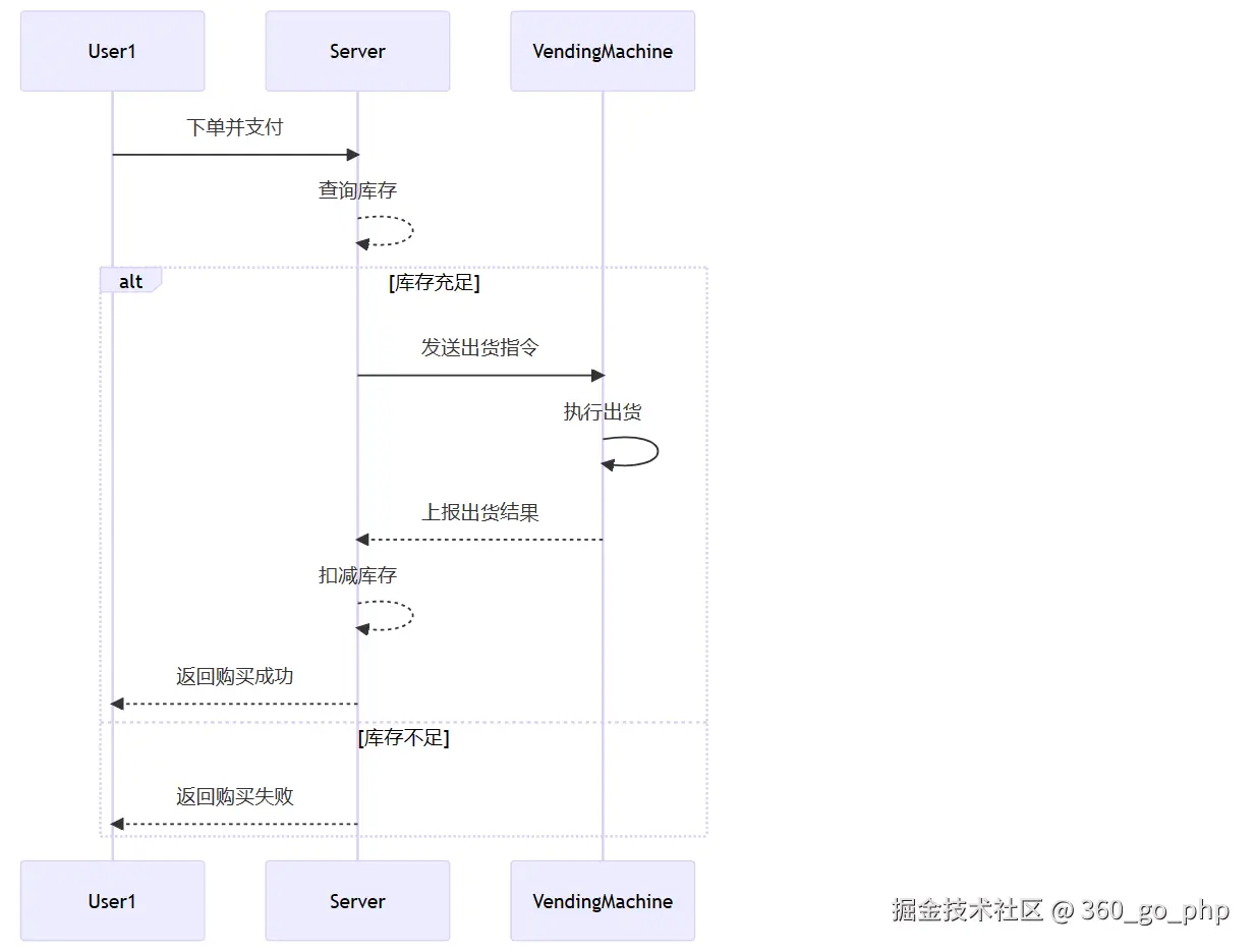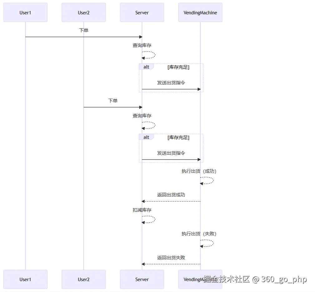 当用户下单时,会判断当前要购买的商品在该售货机的库存,如果当前库存为1件,也是可以下单的,用户这个时候下单并支付,支付成功后,支付系统回调我们的订单微服务,订单微服务向售货机发送出货指令,售货机终端执行出货,并向服务端上报结果,服务端的售货机微服务再扣减库存。这期间其实至少也需几秒左右的时间才能完成。而如果在这期间,另外一个人也着急购买商品,扫描并下单购买同一个商品,那么这个时候第一个人购买的流程还没有结束,库存还没有扣减,所以显示的商品仍然还有一件,那他仍然可以下单。等他支付完成后,售货机没有商品可以出货了,这个时候就产生了超卖。