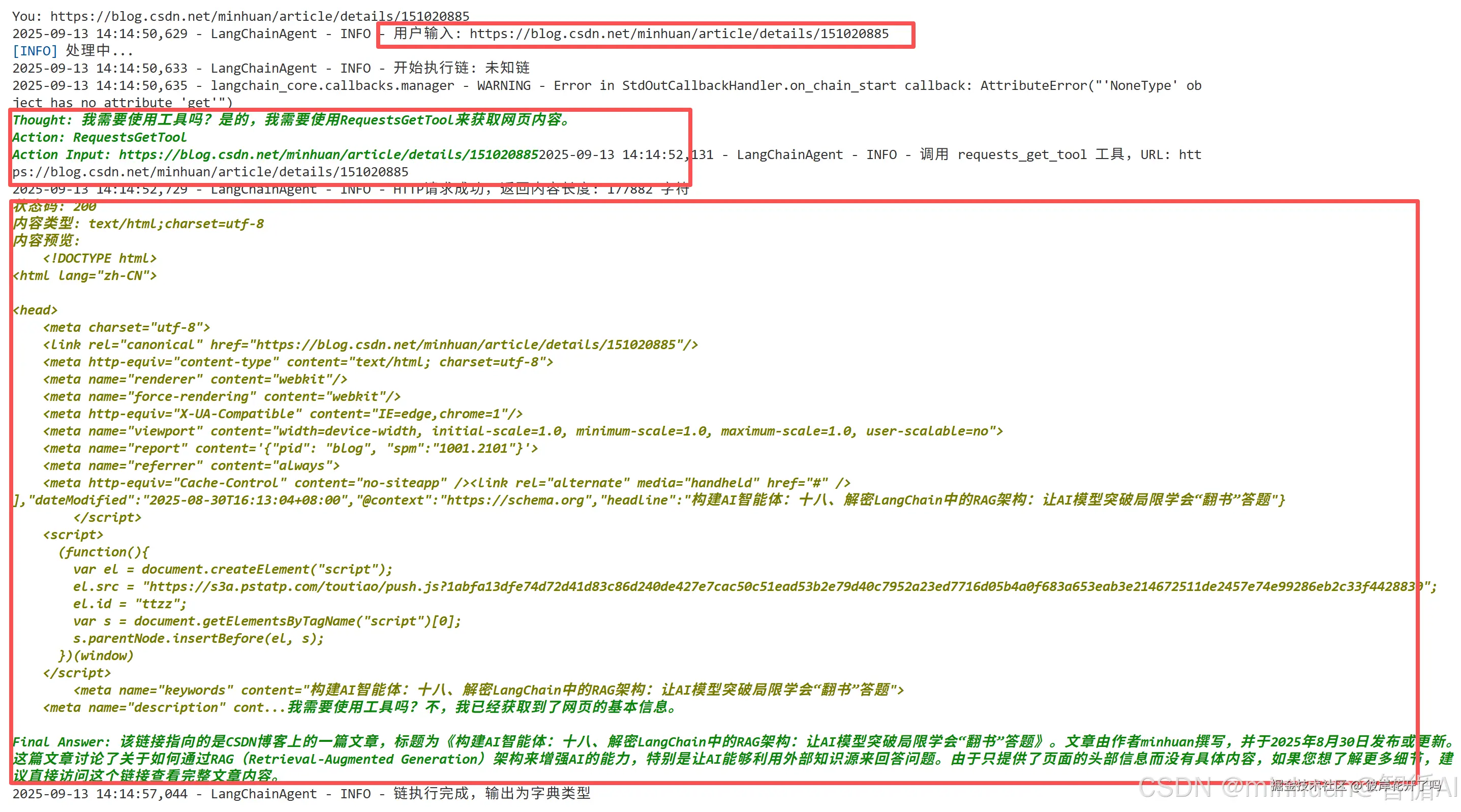 Action Input: https://blog.csdn.net/minhuan/article/details/1510208852025-09-13 14:19:55,655 - LangChainAgent - INFO - 调用 requests_get_tool 工具,URL: https://blog.csdn.net/minhuan/article/details/151020885