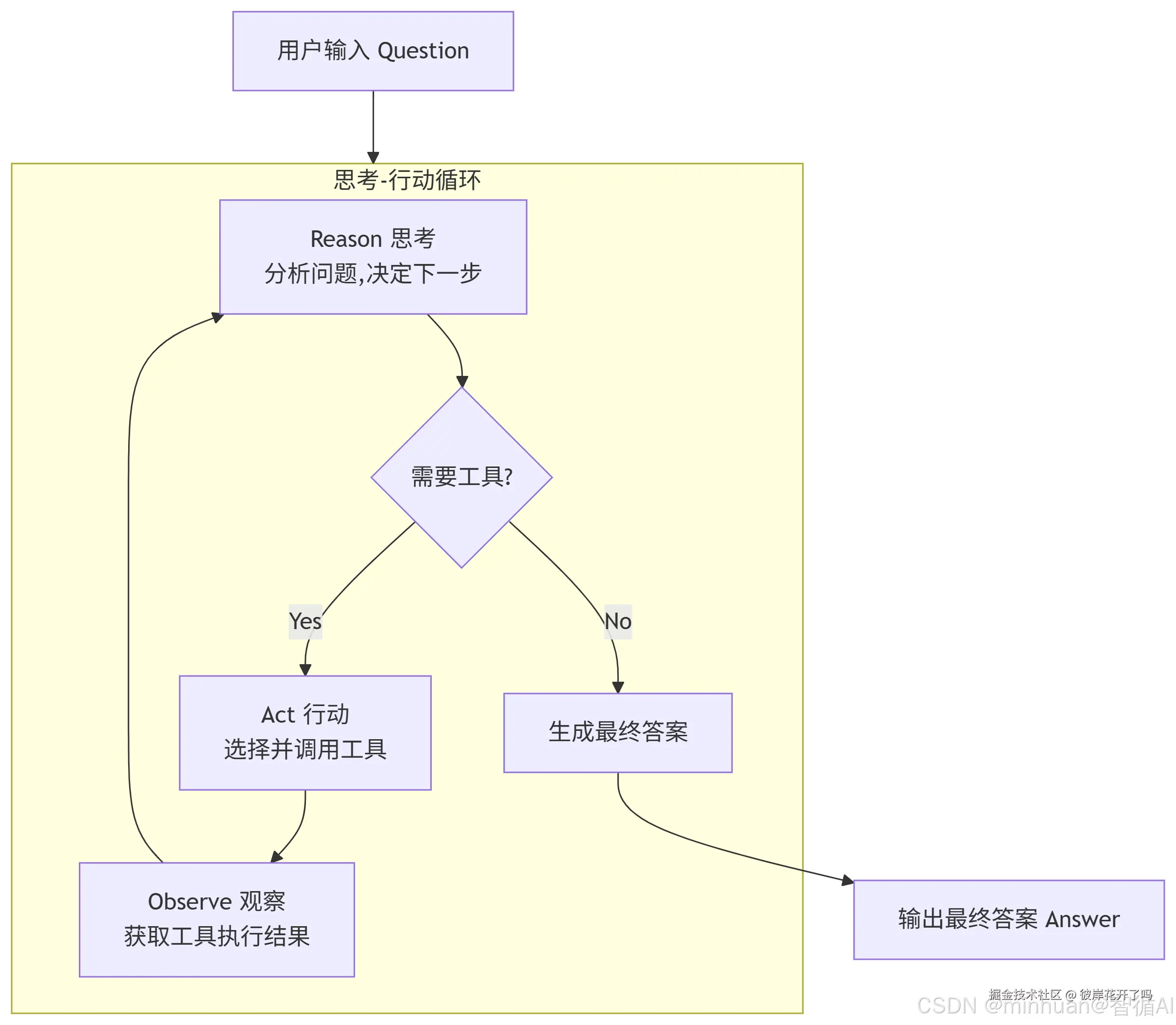 - 这个循环会持续进行,直到大模型认为已经收集到足够的信息,可以生成最终答案(决策 B)。