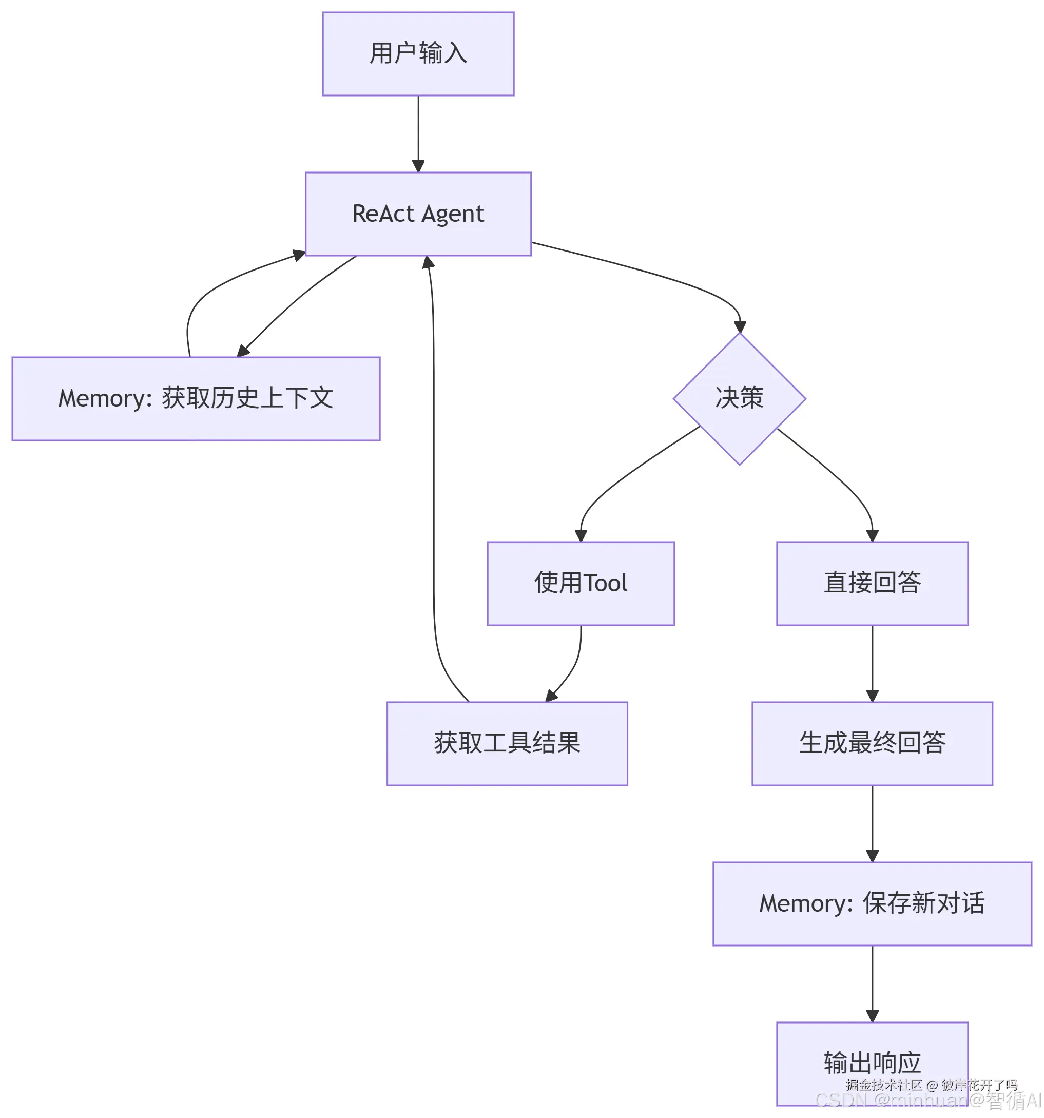 - 随后,系统会将本轮对话中有价值的信息(用户输入和AI输出)保存到 Memory 中,以确保下一次交互的连贯性。