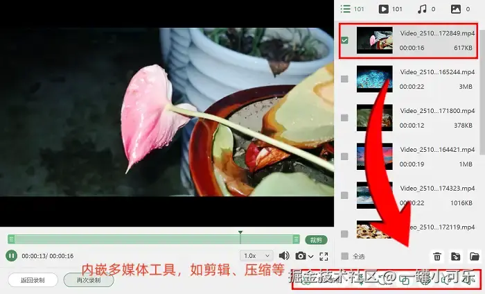 步骤3:视频录制结束后,软件会自动弹出预览页面,在此可以对视频进行基础剪辑。若需要实现视频分段、添加特效等进阶编辑功能,点击进入 “高级剪辑” 页面就能操作了。