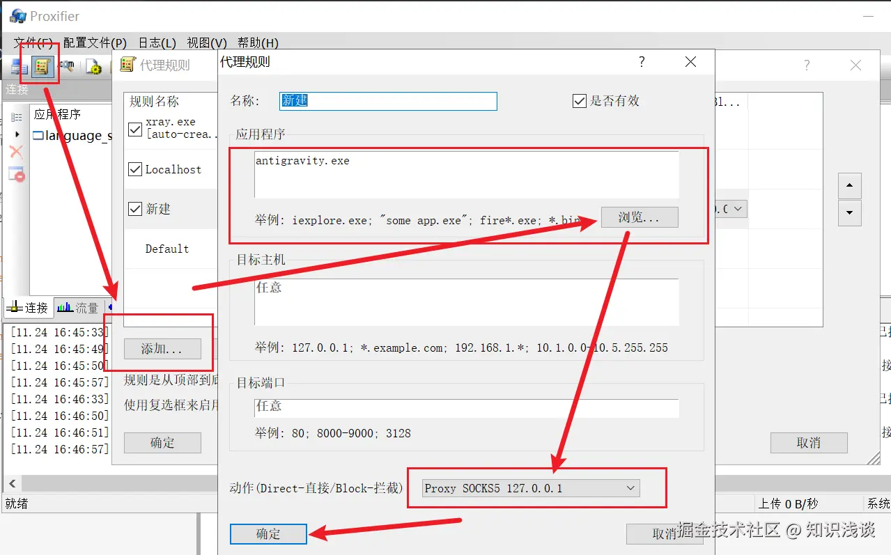 点击代理规则-->添加-->选择应用程序antigravity.exe-->选择动作sockets5那条记录,点击确定即可