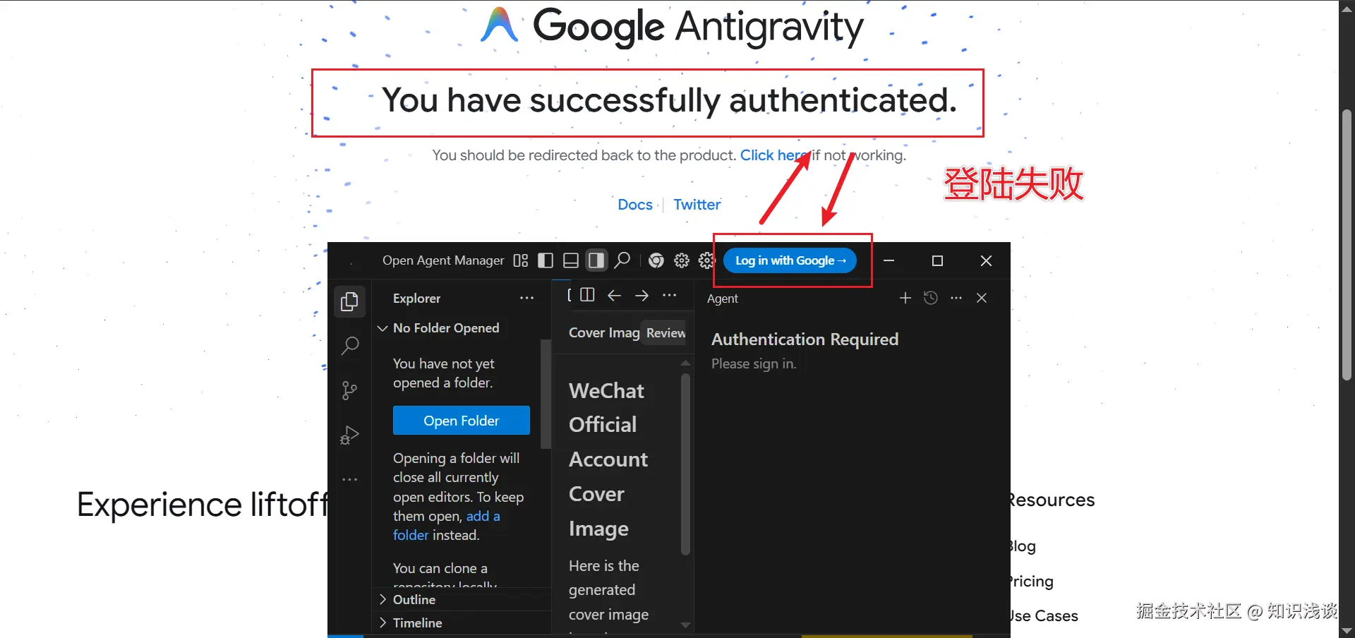 登陆失败案例:你网页显示登陆了,但是Antigravity还是没登陆。