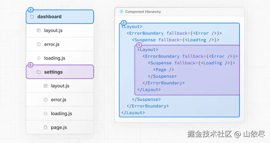 layout.js布局文件,默认Server Componentstemplate.js同 layout.js,但是在导航时重新同步执行useEffecterror.js(React 错误边界)loading.js(React Suspense 边界)not-found.js(notFound函数执行时渲染 UI)page.js或嵌套的layout.js(必要的)
