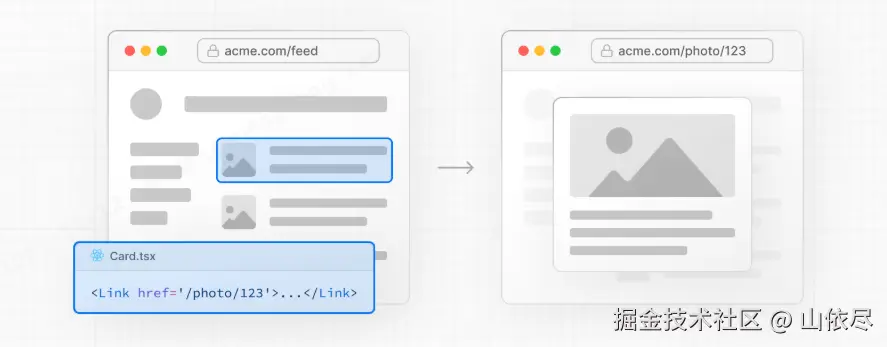例如,当点击信息流中的照片时,你可以在模态框中显示该照片并覆盖在信息流上方。这种情况下,Next.js 会拦截 /photo/123 路由,隐藏 URL 并将其覆盖在 /feed 之上。