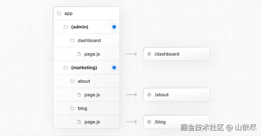 | (folder) | 不影响实际路由的分组 | app/(shop)/a/page.js | /a |