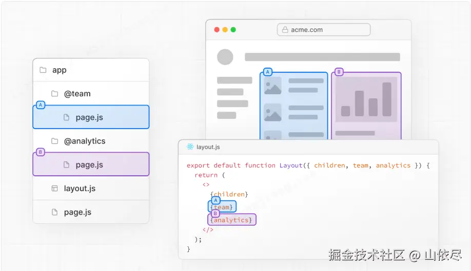 在一个仪表盘应用中,您可以使用并行路由同时或条件性渲染 team 和 analytics 两个页面