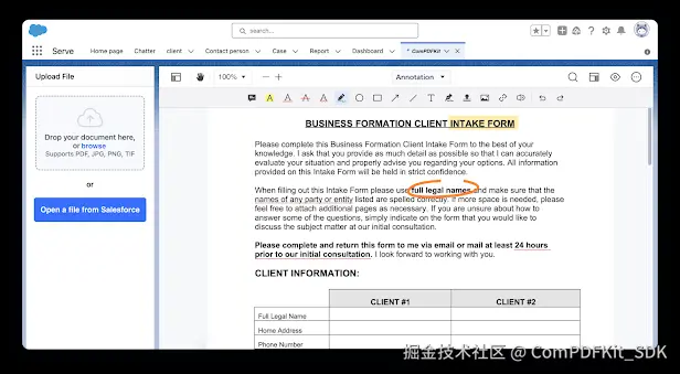 实时操作: 用户可以直接在Salesforce界面内完成高亮、批注、文本修改、表单填写甚至电子签名,无需离开平台。