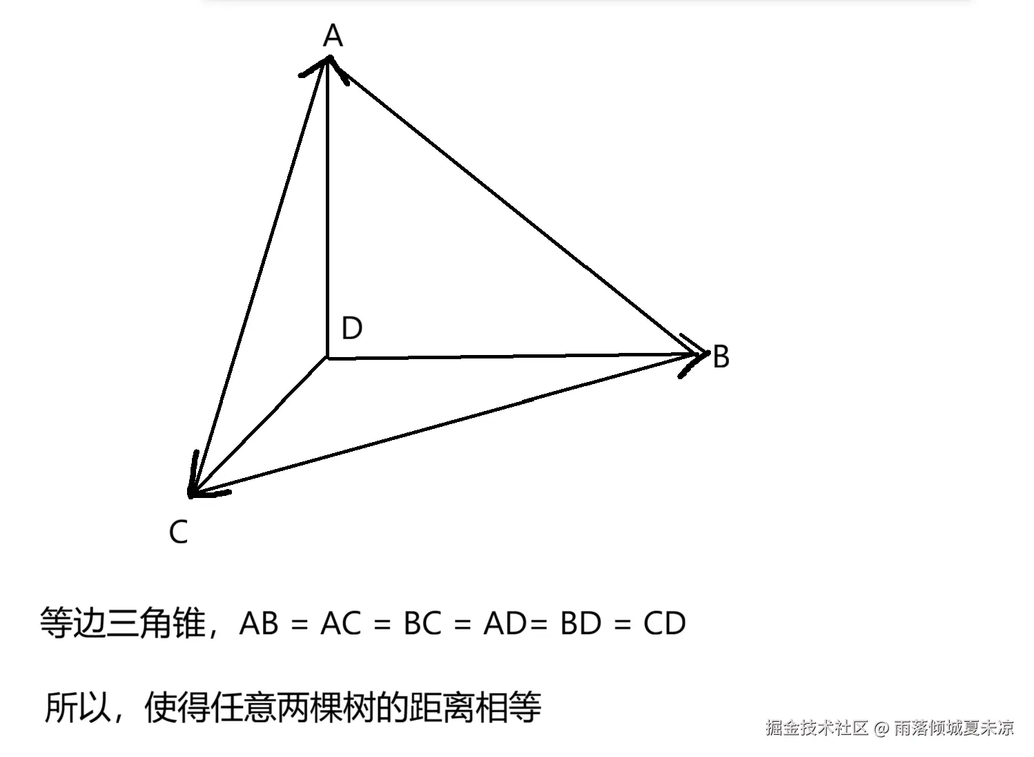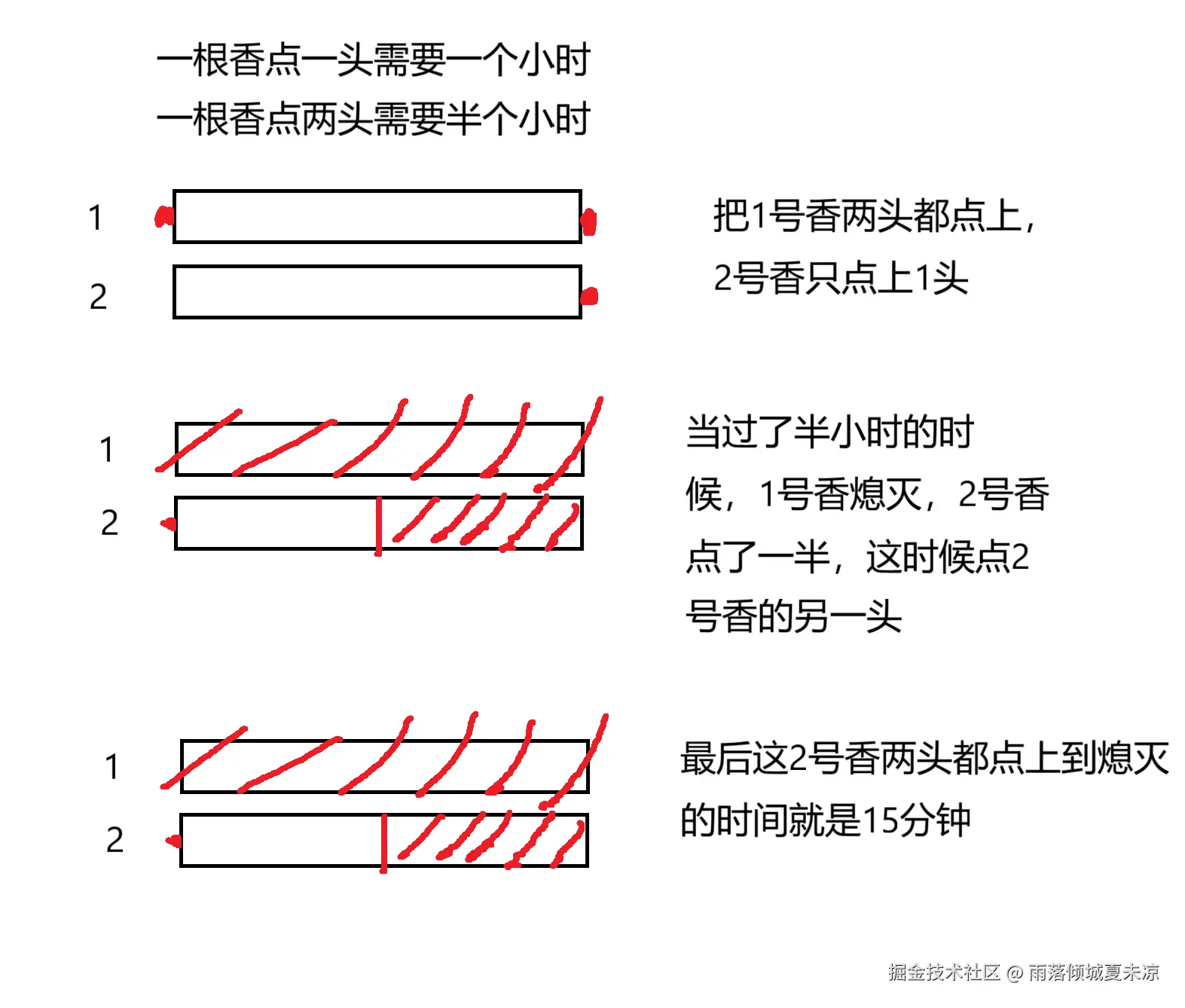 2.程序思维习题 雨落倾城夏未凉 2025-11-24 31 阅读1分钟 1.怎样种四棵树使得任意两棵树的距离相等? 2.有两根不均匀分布的香,香烧完的时间是一个小时,你能用什么方法来确定一段15分钟的时间?